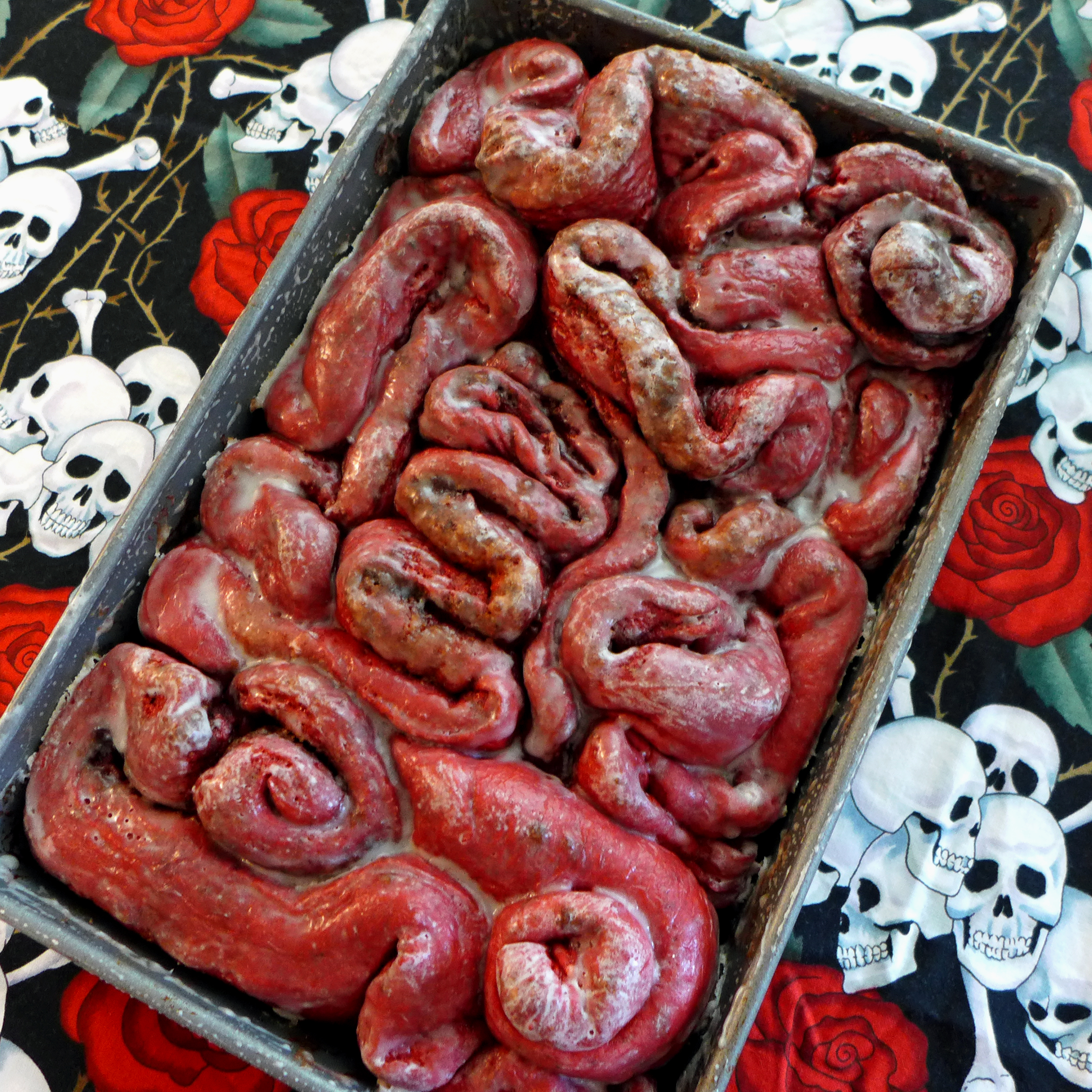 These deep red, fleshy cinnamon rolls make a tasty stand in for freshly ripped strands of human meat. They’re also a lot less likely to get you arrested.