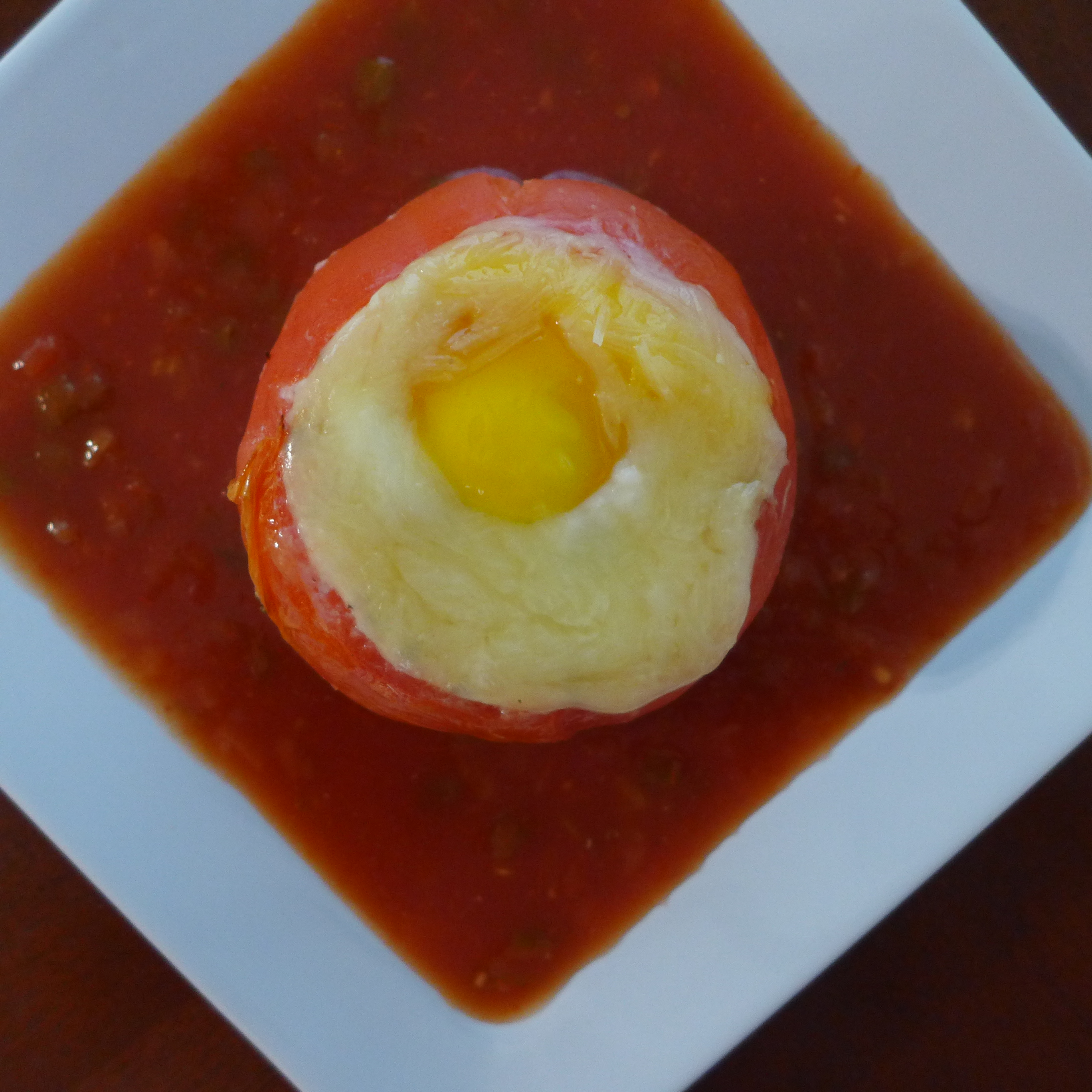 Core the tomatoes like you’re ripping the core from an arc reactor. Cut away just enough so an egg fits snugly inside.