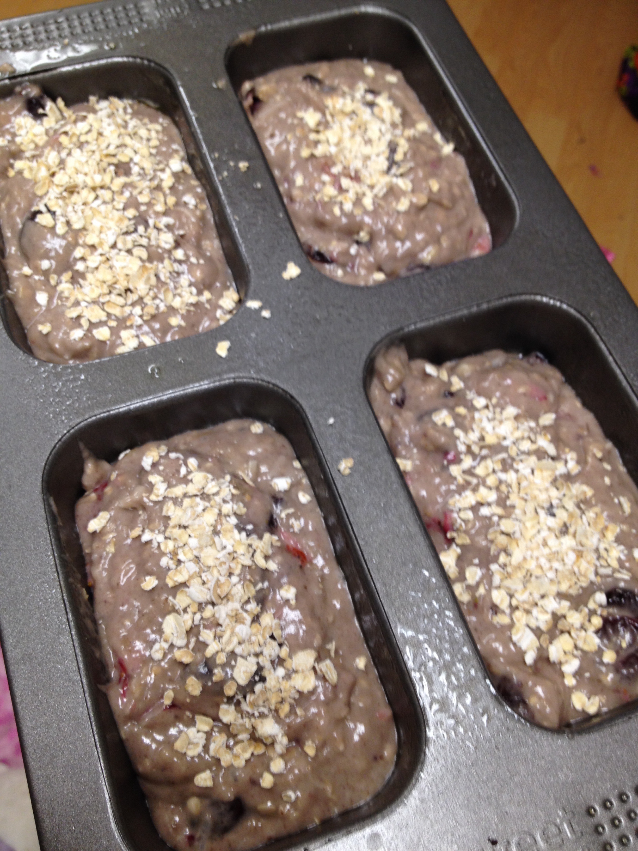 Sprinkle extra oats on top of each loaf and bake for 25-30 minutes for mini-loaves. For regular loaves, start checking them at 35 minutes. For muffins, check them at 15 minutes.