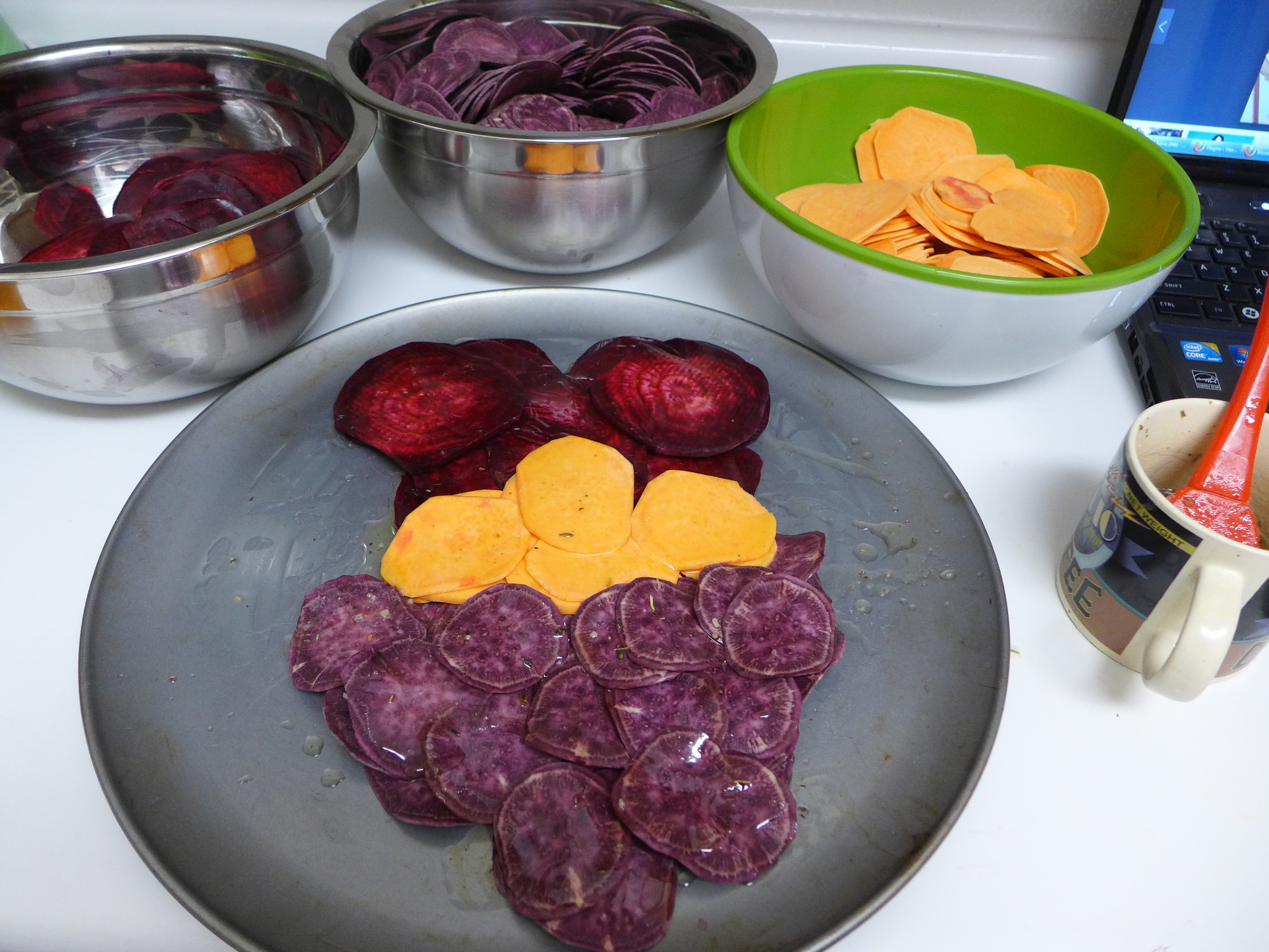 Peel your beets, sweet potatoes, and purple sweet potatoes. The beets will be her heaving bosom of justice, the orange sweet potatoes her mighty, crown-like belt, and the purple sweet potatoes will become the base of her star spangled panties. Purple sweet potatoes are an incredibly brief seasonal item mostly found at Farmer’s Markets and Whole Foods in the early autumn. You can also use blue potatoes, which are equally pretentious but have a longer growing season. If you go with the blue starchy potatoes, stick with the savory option.