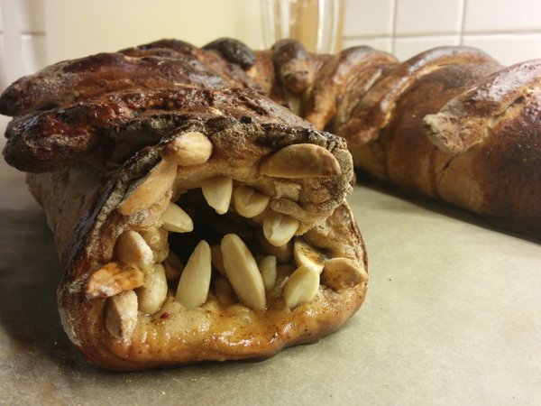Post photos of your Sandworm Bread on Kitchen Overlord’s Facebook Page, or on Twitter, tagged #wormsign. Once the holidays are over and we’re all back to work (for me, Monday, January 4th), I’ll drop all your names in a Guild Navigator’s tank. The first one of you he curses will win a signed copy of Geek Breads and an Illustrated Geek Recipe poster, delivered as soon as the book is released in late February.